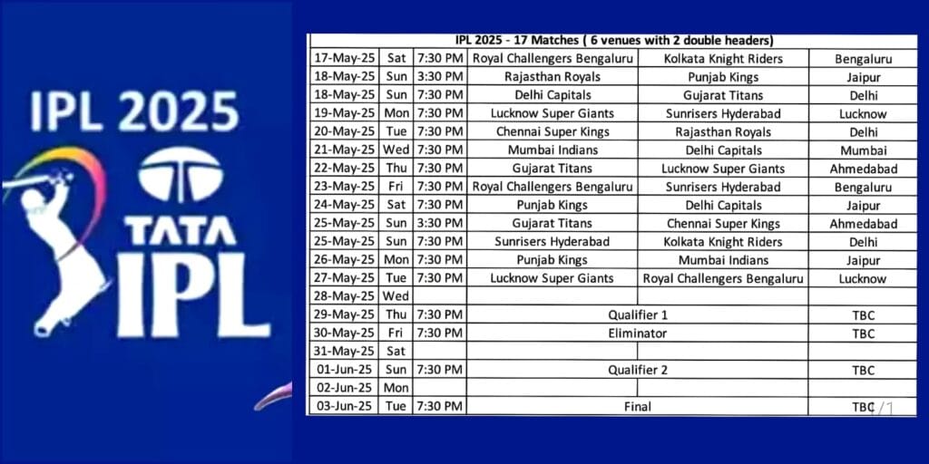 The Board of Control for Cricket in India (BCCI) is pleased to announce the resumption of the TATA IPL 2025. After extensive consultations with government and security agencies, and with all the key stakeholders, the Board has decided to proceed with the remainder of the season.